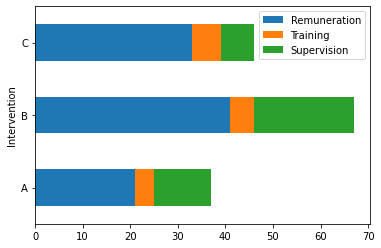 bar = df.plot.barh(x='Intervention', y={'Remuneration','Training','Supervision'}, stacked=True )但是,我注意到,根据输入数据集,matplotlib改变了绘制列的顺序。例如,有时将薪酬作为堆叠条形图的第一个组成部分,而在其他情况下则将薪酬改为培训或监督。老实说,我还没有弄清楚正在使用的订单是什么。理想情况下,我希望始终保持相同的顺序,因为我有一个颜色列表,以供使用。有什么办法强迫我们重新排序吗?堆叠的条形图总是以薪酬培训监督的形式出现吗?