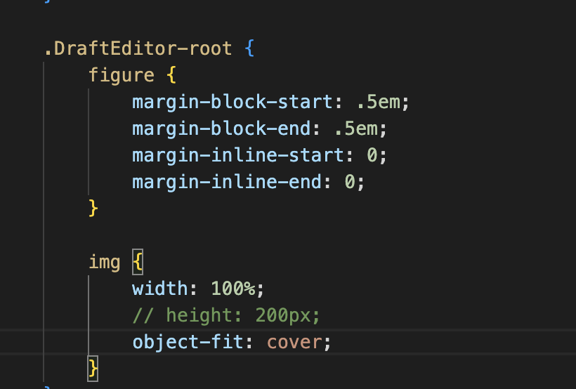 您可以将组件样式表上的draft.js编辑器中的图像作为目标。下面是一个使用scss的屏幕截图示例: