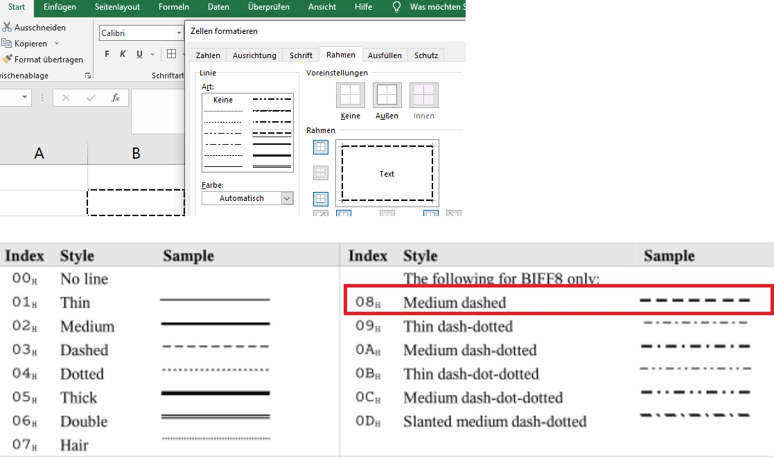 (1) --你找不到线上虚线的介质,因为没有。作为边框绘制的线是lineStyle和Weight的组合。lineStyle为xlDash,权重为表中值03的xlThin,值08为xlMedium。
