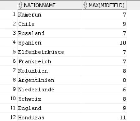 Player(PlayerID<PK>,Role,Nationname)我承认,我并不真正了解子查询如何与聚合函数协同工作。我试图像这样在表中找到最大的中场数量,但是我没有得到任何输出: