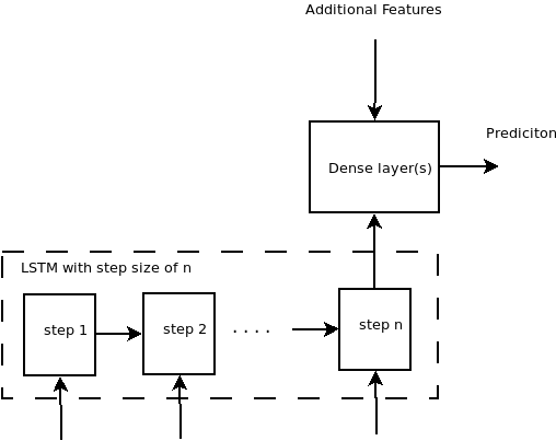 因为这不是一个标签问题,所以在最后一次重复/步骤之后,您将把一个密集的层连接到LSTM的输出。对于最后一个密集的层,您可以提供额外的功能。直觉是,在n步中使用LSTM获得隐藏表示,然后将附加的特征连接到最后一步的隐藏表示中,并通过密集层将其运行,最后映射到单个预测。