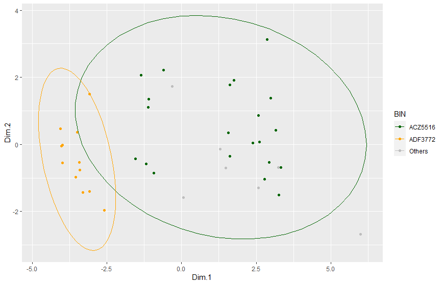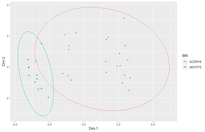 stat_ellipse(data = df %>% filter(BIN %in% c("ACZ5516", "ADF3772")), type="norm") +