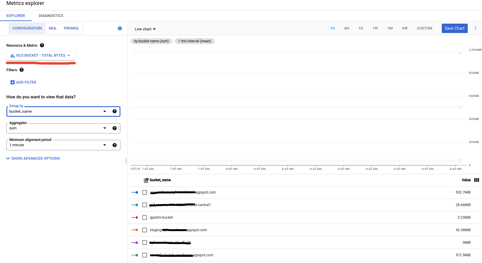 您还可以使用云监视下的Metrics,在Metrics >FilterResource&Metrocby GCS Bucket Total Bytes上显示项目中所有桶的使用情况。