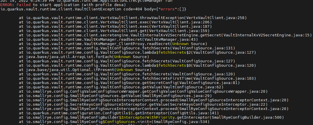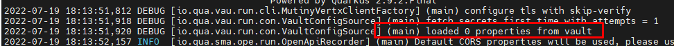 当我禁用此属性时:quarkus.vault.secret-config-kv-path,正在运行的应用程序,但没有加载任何机密,这是控制台消息: