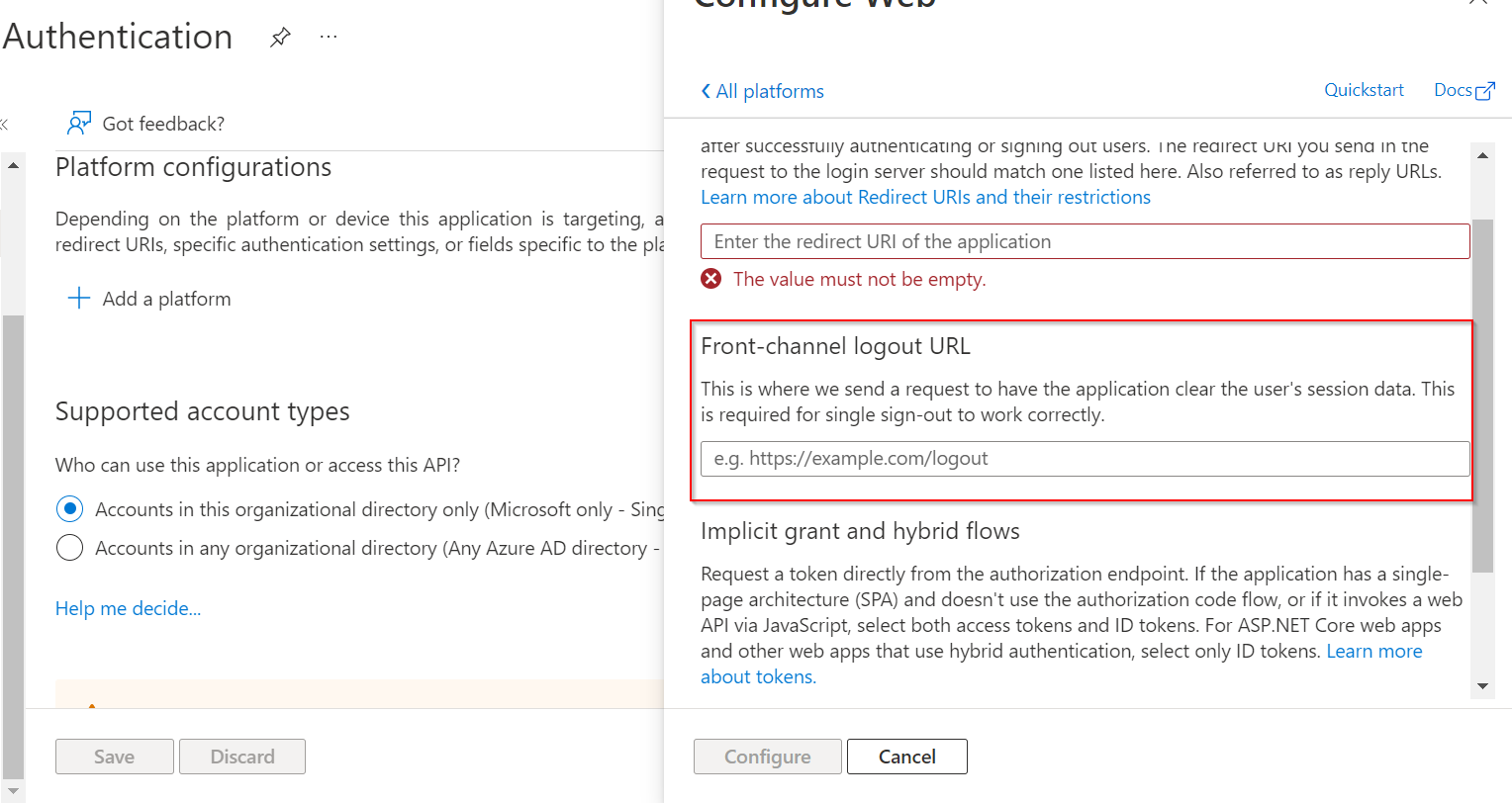 front channel logout的概念。front channel logout中,我们基本上加载了一个不同的页面,它将完成所有的注销过程和清除缓存,并停止对站点的本地访问。在这里,页面将被加载到隐藏的iframe中,并且只执行签出操作。system.allowRedirectInIframe设置为true。此外,我们还必须在门户注册注销url。