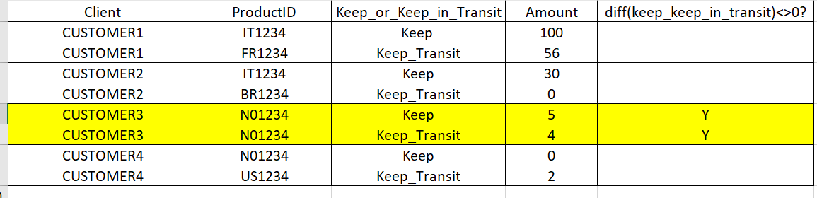 如何添加一个新列,以检查列:Amount中值的减法是否与相同的ProductID和Client中的0不同