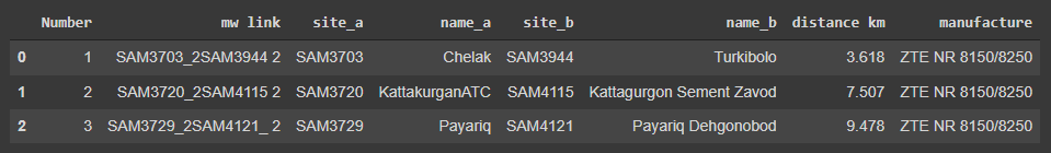 data_dict = {'Number': {0: 1, 1: 2, 2: 3}, 'mw link': {0: 'SAM3703_2SAM3944 2', 1: 'SAM3720_2SAM4115 2', 2: 'SAM3729_2SAM4121_ 2'}, 'site_a': {0: 'SAM3703', 1: 'SAM3720', 2: 'SAM3729'}, 'name_a': {0: 'Chelak', 1: 'KattakurganATC', 2: 'Payariq'}, 'site_b': {0: 'SAM3944', 1: 'SAM4115', 2: 'SAM4121'}, 'name_b': {0: 'Turkibolo', 1: 'Kattagurgon Sement Zavod', 2: 'Payariq Dehgonobod'}, 'distance km': {0: 3.618, 1: 7.507, 2: 9.478}, 'manufacture': {0: 'ZTE NR 8150/8250', 1: 'ZTE NR 8150/8250', 2: 'ZTE NR 8150/8250'}}