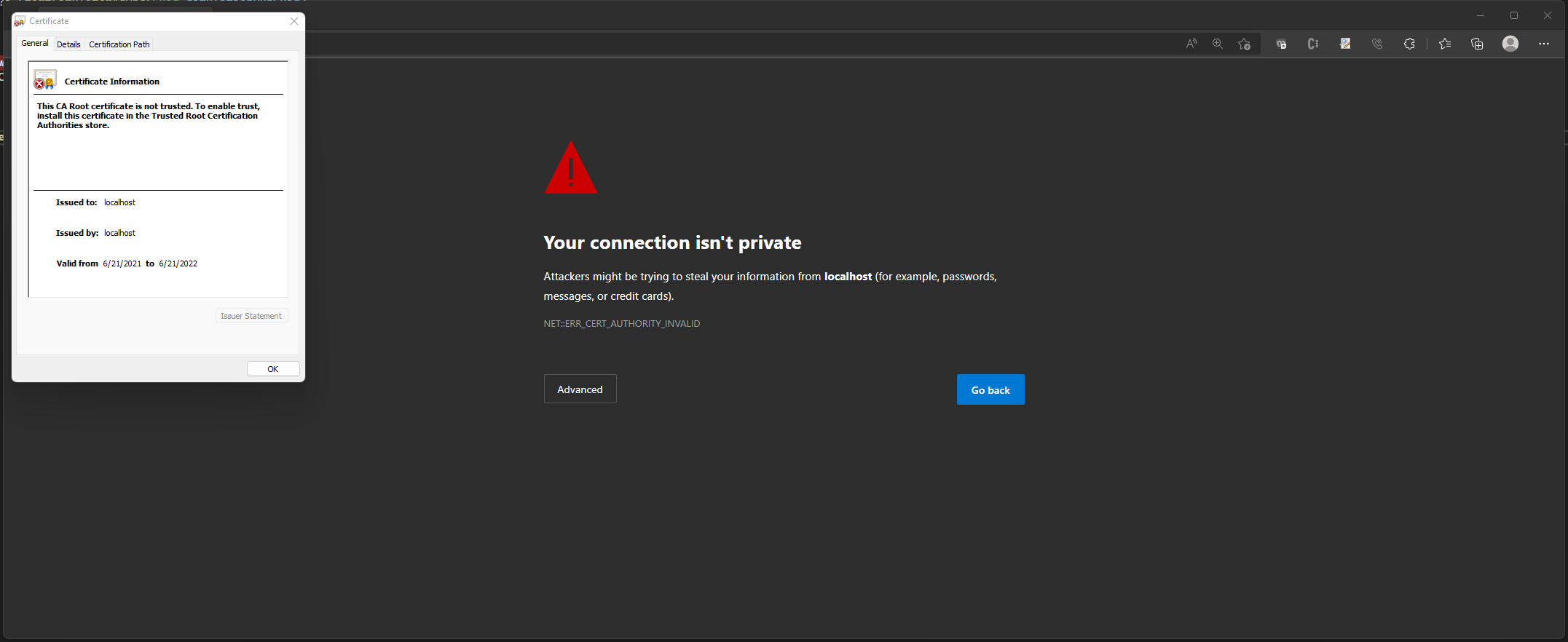 我有一个.NET 6网络应用程序,在自我托管模式下运行良好,直到2022年6月21日VS 2022。现在,当我运行在https://localhost:7097上打开的同一个应用程序时,浏览器(Edge)表示证书权限无效,并表示站点不安全。