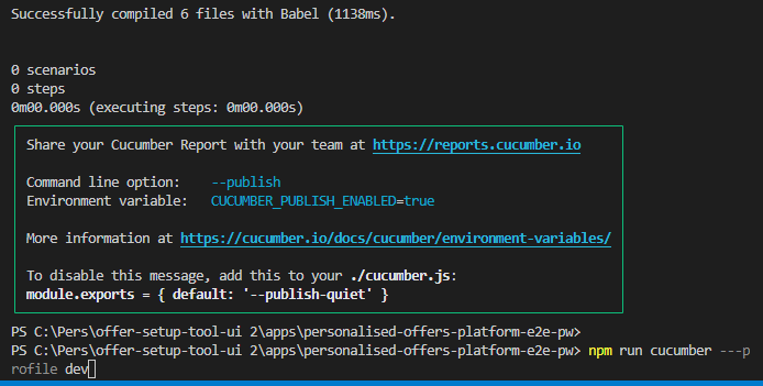 在我的剧作家测试中,我试图使用npm run cucumber --profile dev运行一个黄瓜特性,但是没有获得任何场景: