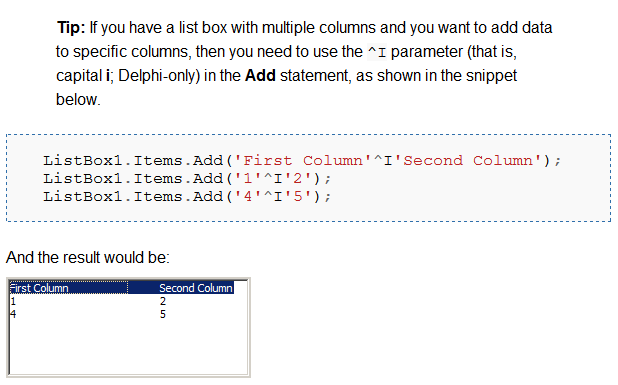 ListBox1.Items.Add('First Column'^I'Second Column');