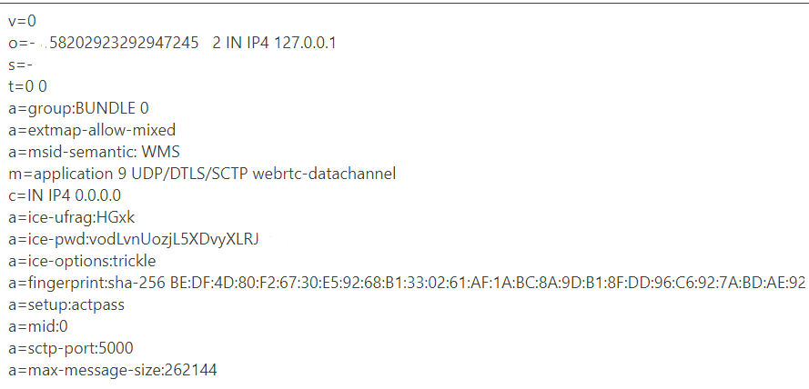 当我试图从下面的代码返回localDescription时,我会得到一个在sdp下不包含candidate参数的响应,如屏幕截图所示。