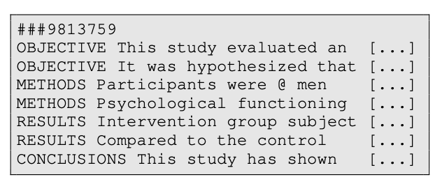 嗯,我试图在Pubmed200k随机对照临床试验数据集上复制一个来自纸的模型,你可以在这个纸中找到它。
