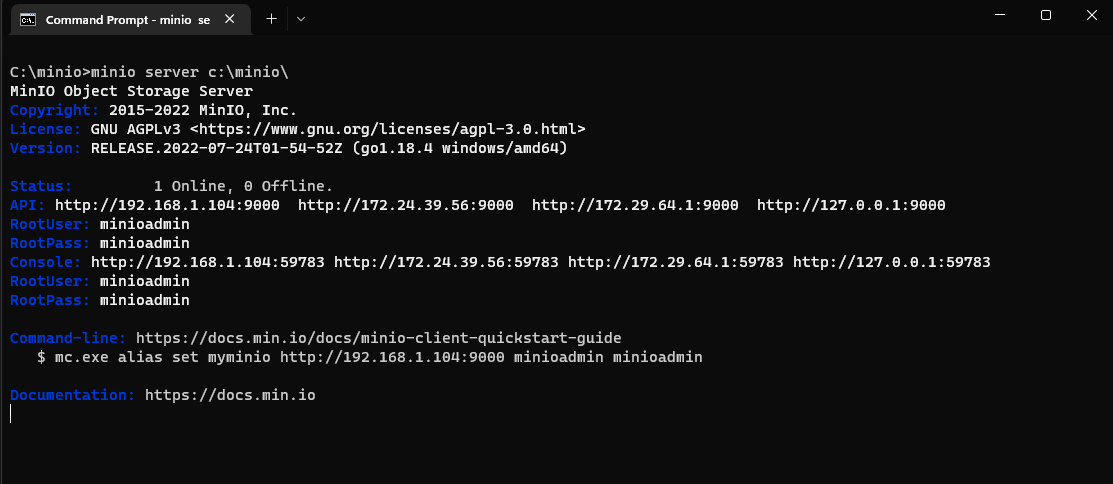 我在C:\minio中构建了一个文件夹,并使用以下命令运行minio