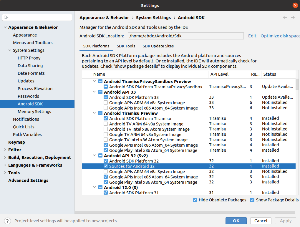 如果还没有,请选中“Android 32的源代码”,如下面的图像所示(单击右上角的SKD Manager按钮查看此图像):