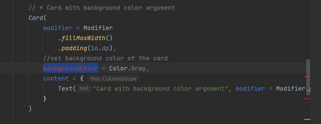 Text("Card with background color argument", modifier = Modifier.padding(16.dp),style = MaterialTheme.typography.labelLarge)