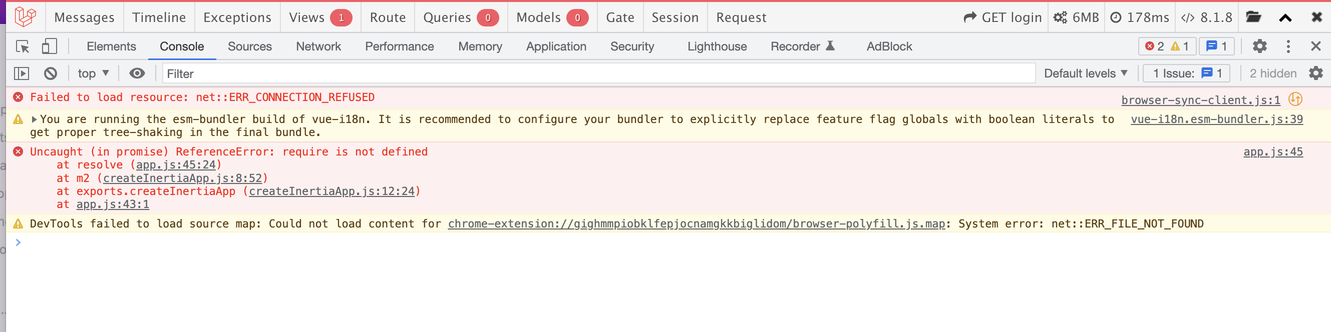 未能加载资源: net::ERR_CONNECTION_REFUSED vue-i18n.esm-bundler.js:39您正在运行vue-i18n的esm bundler构建。建议将您的绑定器配置为使用布尔文本显式替换功能标志全局,以便在最后的包中得到正确的树抖动。initFeatureFlags @ vue-i18n.esm-bundler.js:39 app.js:45 Uncaught (承诺中) ReferenceError: require在m2 (app.js:45:24) at m2 (createInertiaApp.js:8:52) at exports.createInertiaApp (createInertiaApp.js:12:24) at app.js:43:1 DevTools未能加载源映射:无法加载内容的app.js:43:1系统错误: net::ERR_FILE_NOT_FOUND