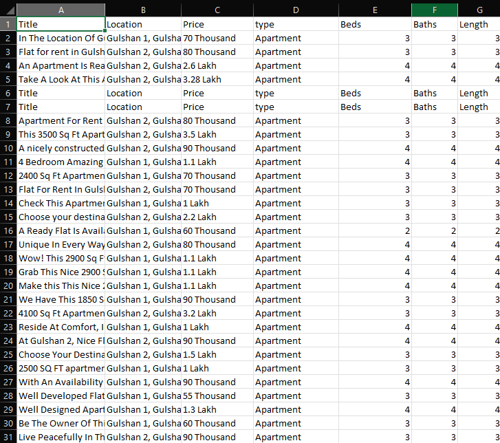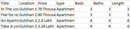 header = ["Title", "Location", "Price", "type", "Beds", "Baths", "Length"]