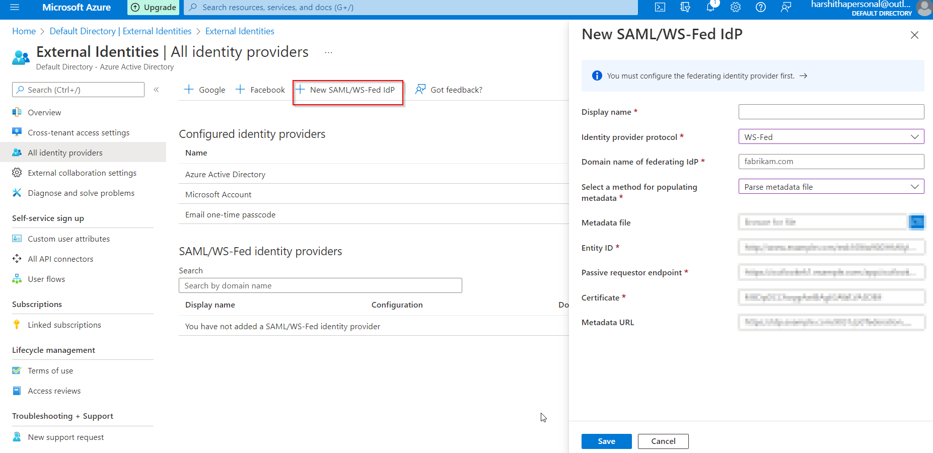 导航到Azure门户 =>Azure Active Directory => 外部标识 => New SAML/WS-Fed IdP