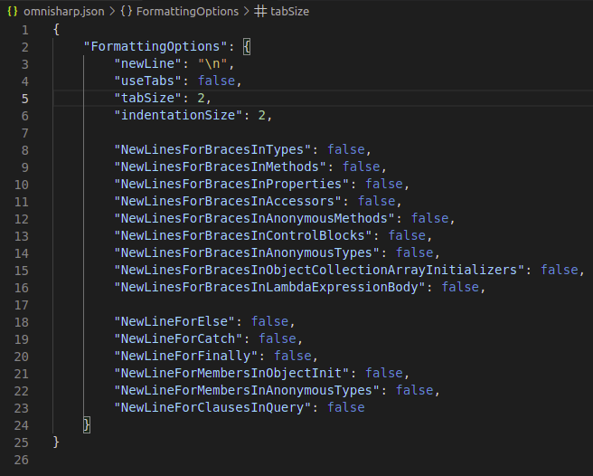 我尝试在indentationSize中将omnisharp.json更改为4,然后重新启动Omnisharp。这使得它缩进了4个空格。因此,格式化程序似乎从我的omnisharp.json中得到了一些东西,但它只是忽略了以前没有的所有NewLine...设置。