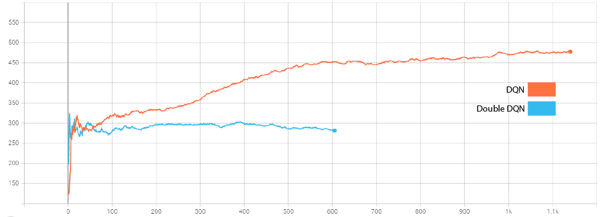 我的问题是,双DQN的表现似乎比香草DQN差得多,我不知道为什么。应该表现得更好对吧?奖励函数有什么问题吗?还是我做错了什么?