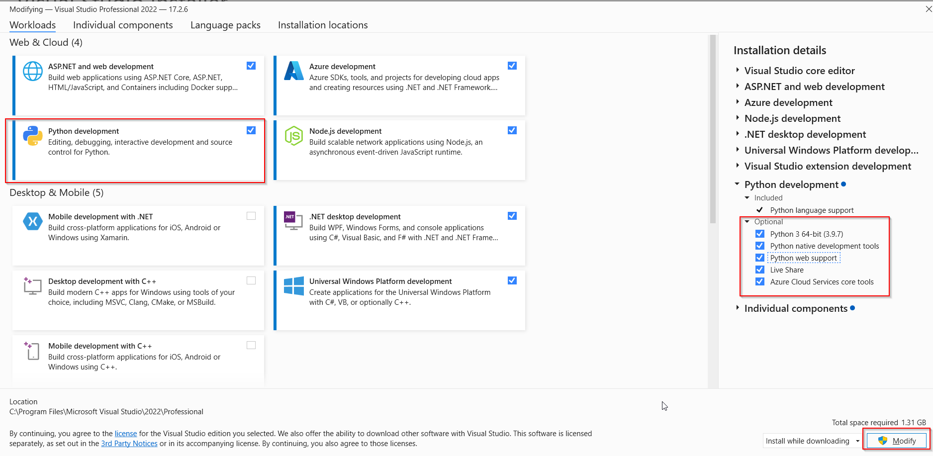 我的Visual安装包括Python模块"Azure Cloud核心工具“以及其他Python开发工具。