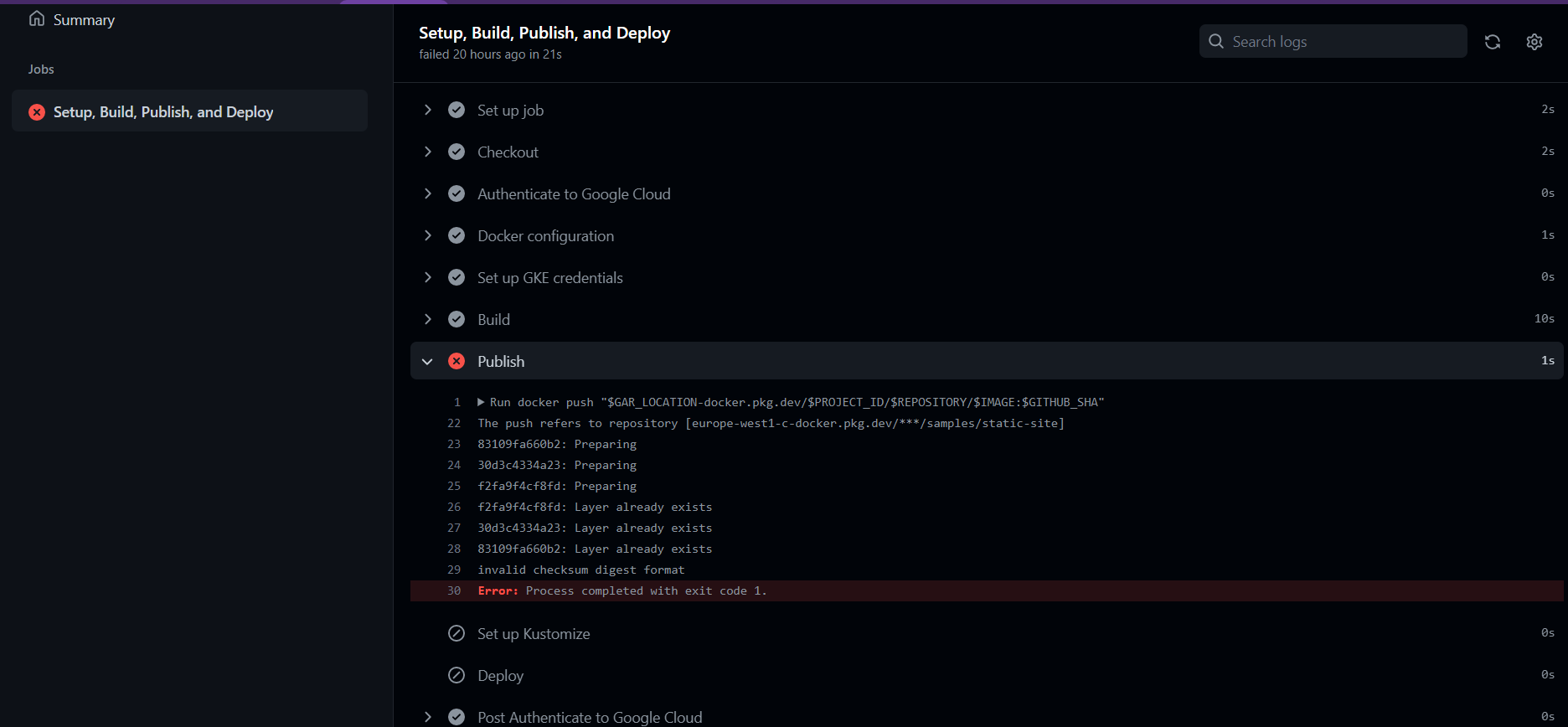 我想使用github操作将我的代码部署到GKE,但是在发布步骤中我得到了一个错误: