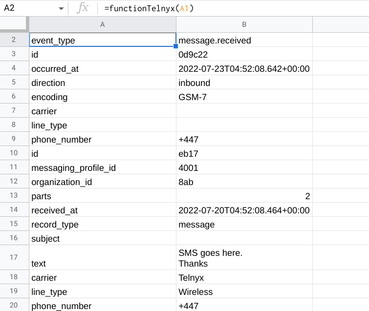 我正在寻找一种方法来解析Google电子表格中使用的单元公式中从Telnyx (通过web钩子)接收到的JSON。理想的结果是将每一行的数据放在单独的列中(包括没有数据的行),并带有正确的标题。联合来文也是一种选择。