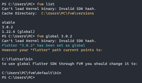 我试图在Windows上使用fvm。因为我的项目使用混合语言,所以我需要在全球范围内更改版本。问题是,它一直要求我改变颤振的路径。一开始,