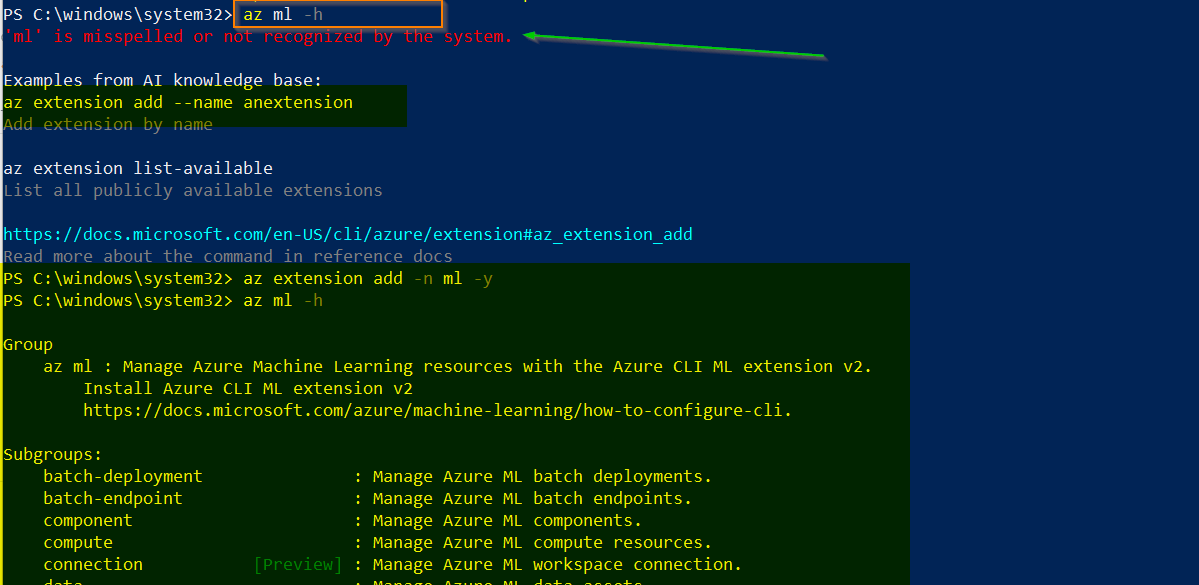 在我尝试了@Dor Lugasi Gal的上述建议之后,我确实观察到了同样的问题,它适用于我(在我的例子中是az ml -h),安装了带有az extension add -n ml -y的扩展之后,可以得到az ml -h的结果,而不会出现任何错误。