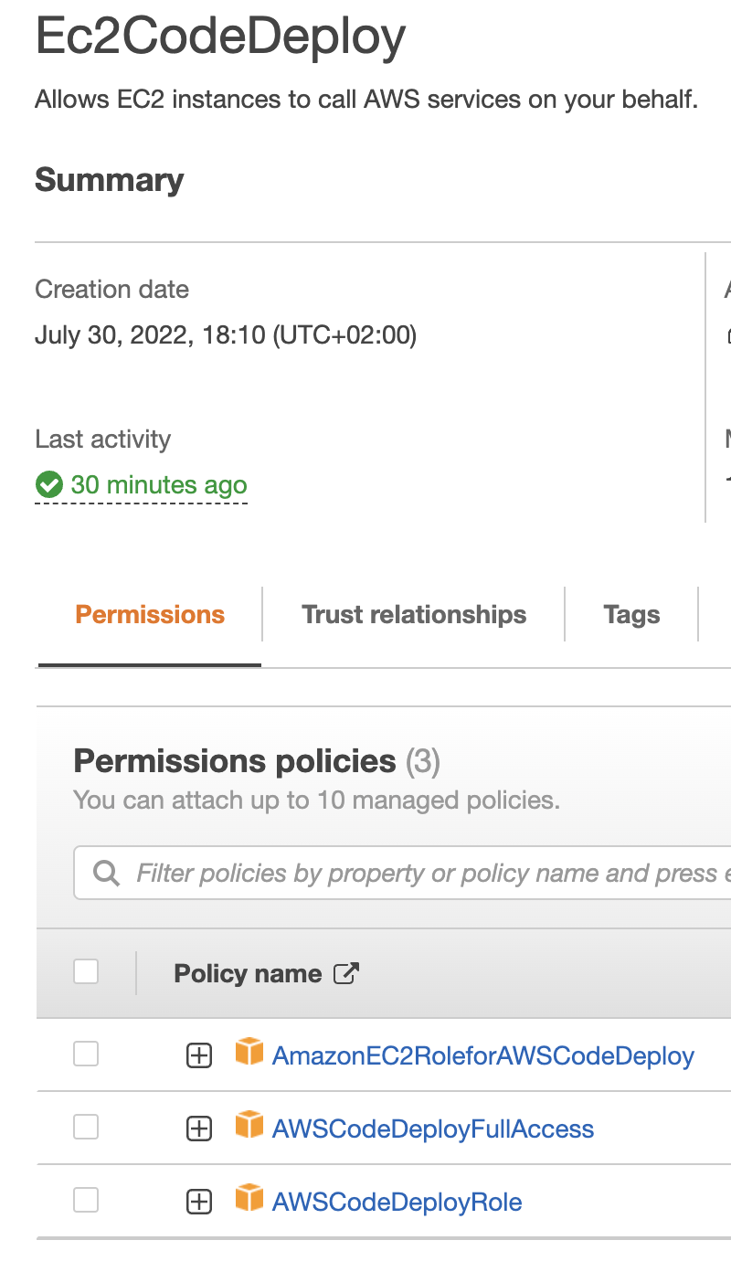 2022-08-01 11:07:49 ERROR [codedeploy-agent(3388)]: InstanceAgent::Plugins::CodeDeployPlugin::CommandPoller: Missing credentials - please check if this instance was started with an IAM instance profileEC2实例分配了IAM角色: