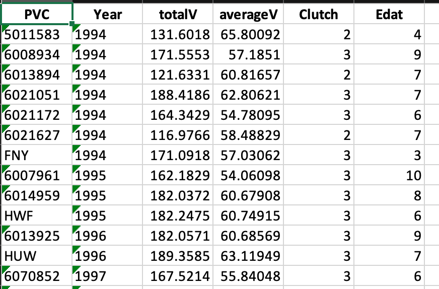 PVC Year ID totalV averageV Clutch Edat