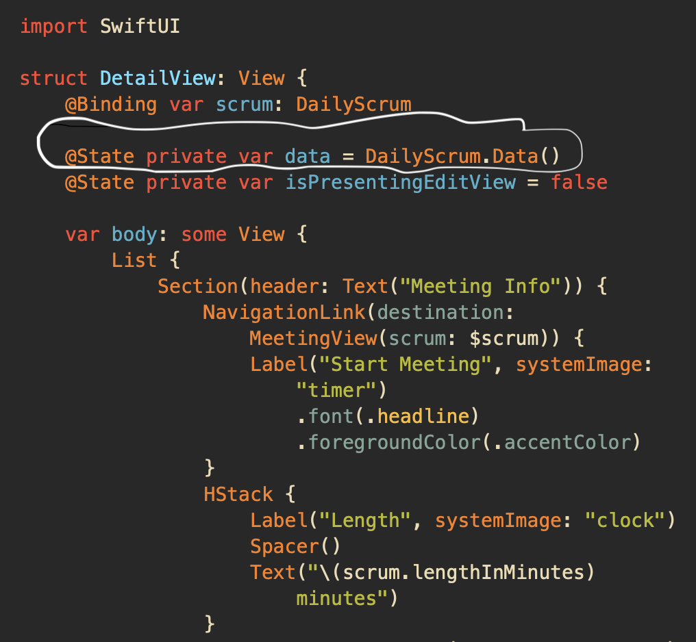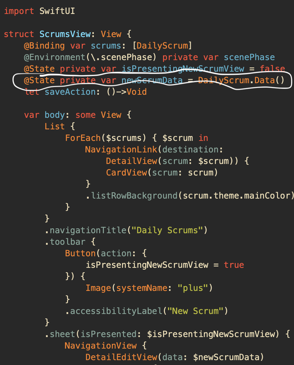我试图弄清楚为什么苹果在两个不同的视图中用@State实例化DailyScrum.Data。我以为你应该只有一个真相来源。我猜一种是用于创建新的scrum数据,另一种是提供更新或编辑scrum数据。但我不确定。