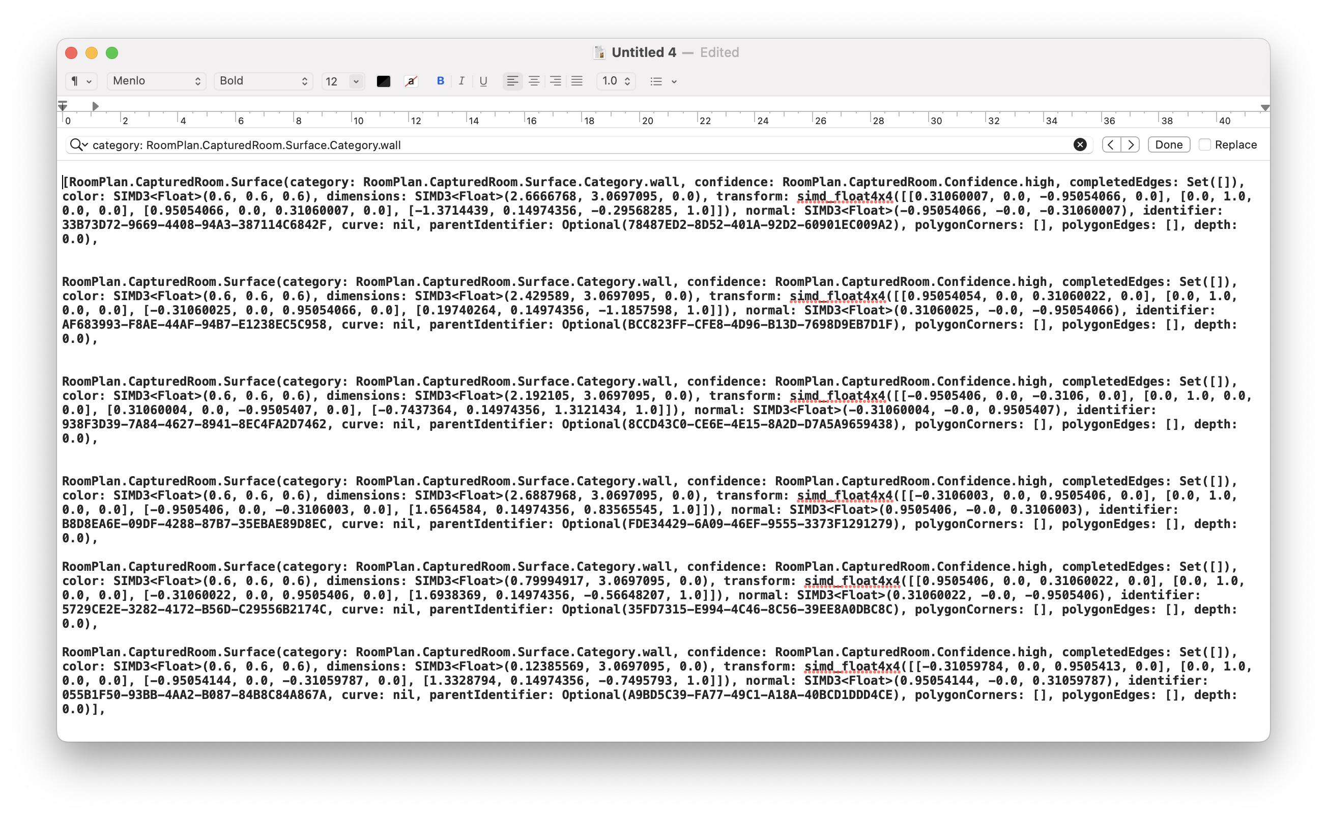 我正在使用RoomPlan sdk获取ios 16中一个房间的3d模型。每个墙壁在api中作为一个表面对象返回,其外观如下:
