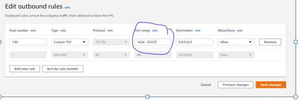 在NACL出站规则中配置emporial端口范围时,我面临一个问题。我正在从本地计算机连接到ec2实例。如果我在NACL出站规则中给出端口范围49153-65535。我正在处理服务器超时问题。因此,我在NACL出站规则中更改了端口范围为1024-65535。现在,我可以连接。我能知道为什么49153-65535端口不能工作吗?