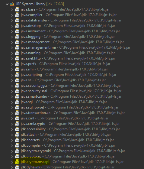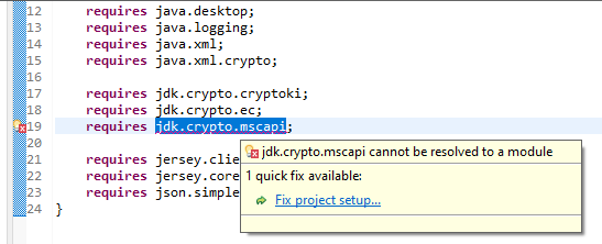 我正在对一个现有的模块化项目做一些更新。出于某种原因,eclipse似乎认为不能将jdk.crypto.mscapi解析为模块。