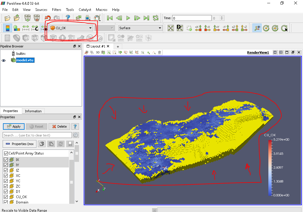 我试着跟踪问题,但是vtu的颜色没有影响。我也尝试过单元数据而不是点数据。我还试过查找表,它用颜色标尺显示,但对模型颜色没有影响。