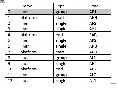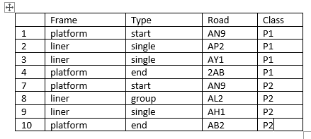 我希望能够只提取平台(“框架”列)的每个起点(“类型”列)到平台(“框架”列)的每一端(“框架”列)中存在的所有数据行作为下面的输出,并将类列中的数据命名为P1 (第一个平台开始和平台结束中的所有行)、P2 (第二个平台开始和结束)、P3、P4等: