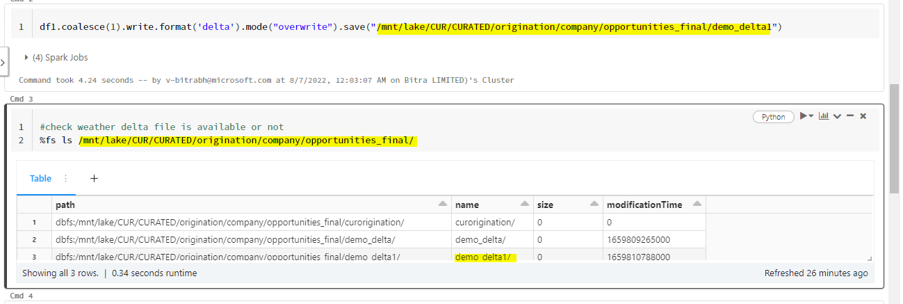 在此之后,我只是将拼花文件转换成增量格式,并将文件保存到这个位置/mnt/lake/CUR/CURATED/origination/company/opportunities_final/demo_delta1中。