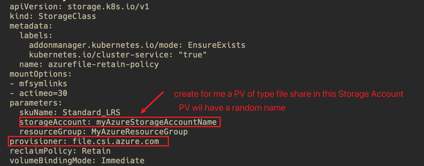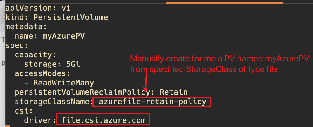 Dynamically -> --通常在云中使用,例如,当您想要将Azure blob/文件挂载到一个pod时。在这种情况下,您无法控制PV名称、StorageClass创建和绑定随机创建的PV。