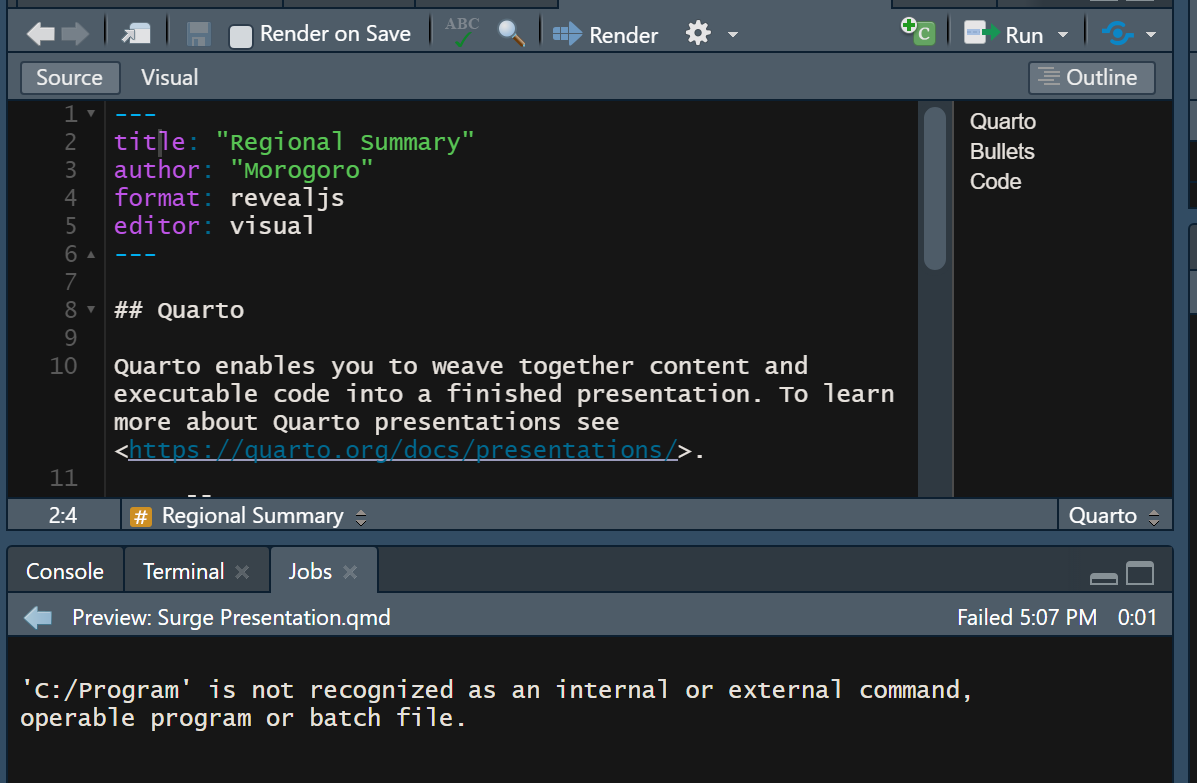 我正在试用Quarto,我使用的是R版本4.2.1。当我转到RStudio、File -> -> Quarto文档并创建一个新文档时,当我尝试通过RStudio呈现按钮呈现时,错误'C:/Program‘不能被识别为内部或外部命令、可操作的进度文件或批处理文件。