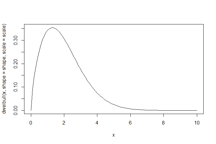 > curve(dweibull(x, shape=shape, scale=scale), from=0, to=10)