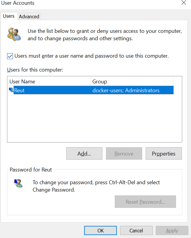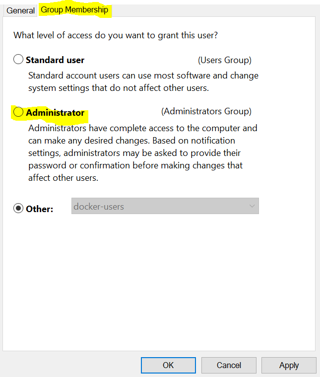 最后,在阅读了此故障排除页面之后,我可以解决这个问题。我试图配置用户和组,然后我意识到由于某种原因,我的用户不是管理员。我已经更改了它,卸载了所有的东西(docker+visual工作室),然后重新安装了它,而且- yayyy!它起作用了,这个错误没有出现。