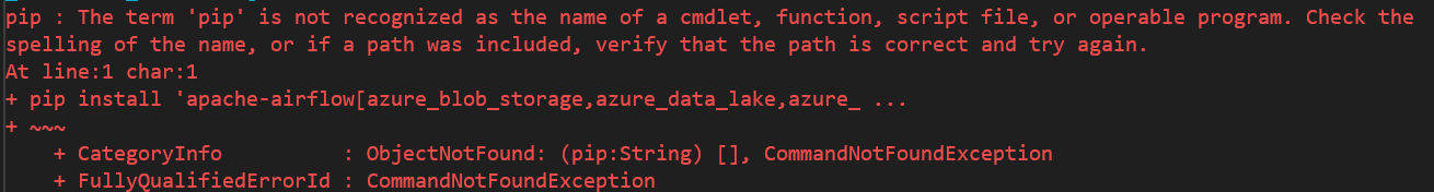 pip install 'apache-airflow[azure_blob_storage,azure_data_lake,azure_cosmos,azure_container_instances]'我发现了一个错误,那就是pip没有被识别: