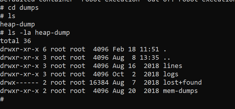 2022-08-08 15:34:55.990 CESTHeap dump file created [26757864 bytes in 0.223 secs]我再次使用-Xmx1G选项部署服务yml文件。然后用命令kubectl exec -it demo-77f84d9957-vxrsz -- sh在pod终端中输入,转到/dumps目录中,没有演示堆转储文件。