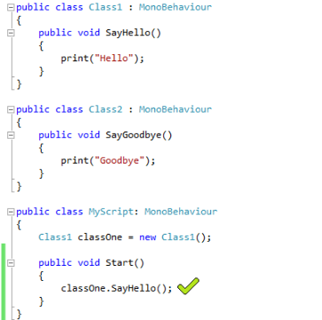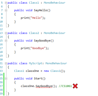 下面的示例演示对类型为SayGoodbye的对象调用Class1方法的尝试。如我们所见,Class1类型不包含SayGoodbye的定义。