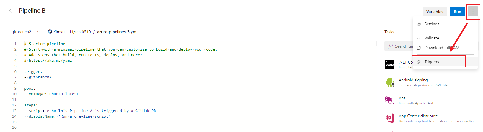 - bash: echo "Pipeline A runs after Pipeline B completes"https://stackoverflow.com/questions/73309727