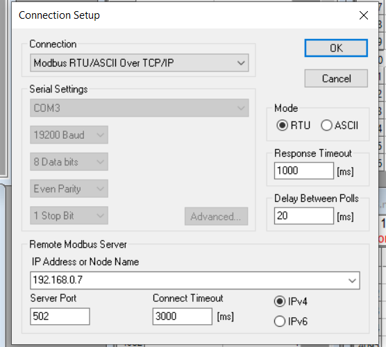 我试图用python在Modbus TCP上读写数据。当我在下面的设置中使用ModbusPoll时,一切都可以工作。