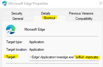 可以在边缘目标中添加标志,以便在边缘InPrivate窗口中打开pdf。您可以右击边缘快捷方式->,在Target末尾单击Properties->,添加pdf url和--inprivate标志。在此之后,下次双击边缘快捷方式时,它将直接在InPrivate窗口中打开pdf。