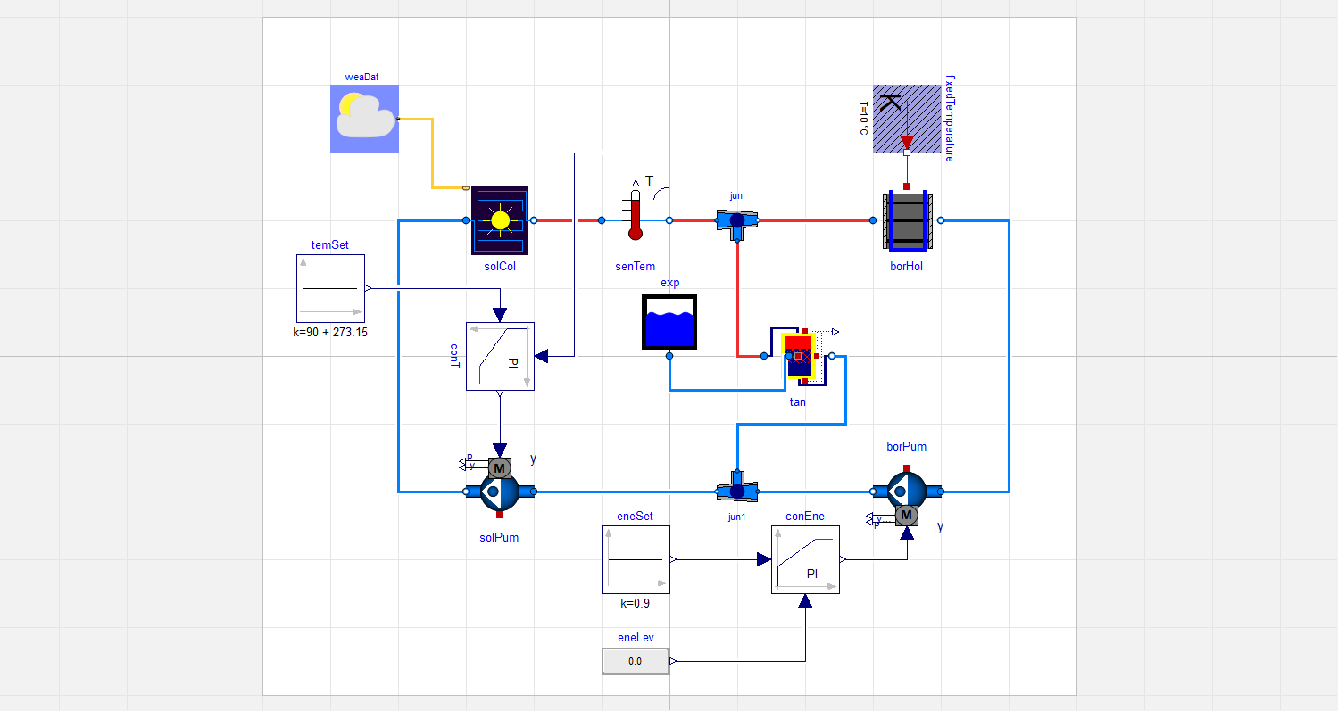 在这个模型中,我想要模拟的变化,在马戏团的wheather条件(例如,太阳辐射全年),太阳能热集热器,首先是热水箱。在热水箱达到最大值之后。允许的温度,来自太阳能集热器的过量热量将被释放到地面。为了模拟热的释放,我采用了带有附加热口的单U管模型.如果不将过量的热量释放到地面,则中等温度(如水)超过太阳能集热器的允许温度130 Celcius。为了模拟从系统中吸收热量的地面以及从系统中抽出多少热量,我应该用哪个组件连接地源换热器的热端口?