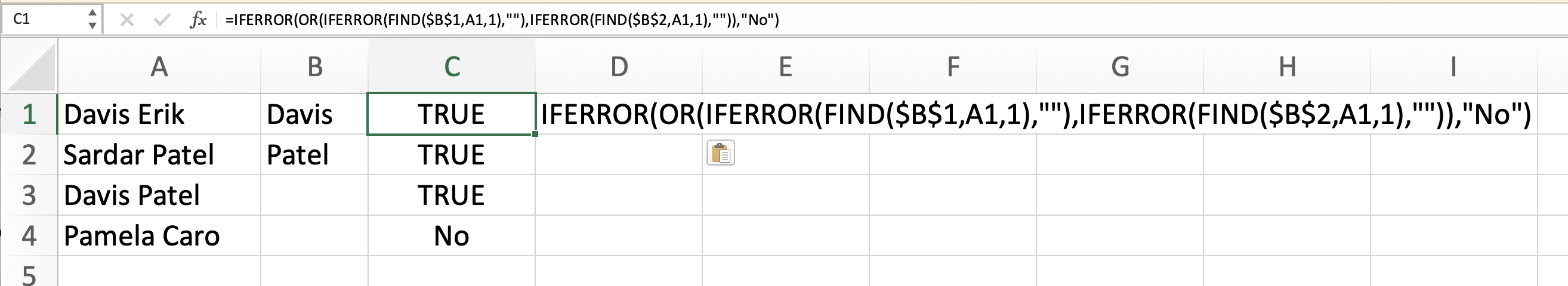 =IFERROR(OR(IFERROR(FIND("Davis",A1,1),""),IFERROR(FIND("Patel",A1,1),"")),"No")发布于 2022-08-12 15:09:31
